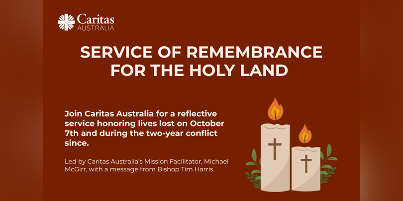 Caritas Australia will host an online Service of Remembrance on October 7, marking two years since the escalation of conflict in the Holy Land, honouring all lives lost and praying for those still suffering.