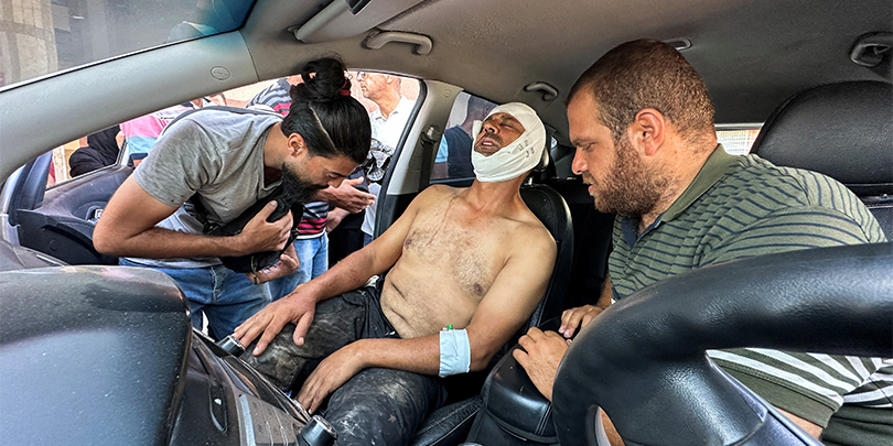 Photographer Hatem Khaled, a Reuters contractor, sits in a car, after being wounded in Israeli strikes on Nasser Hospital in Khan Younis in the southern Gaza Strip, August 25, that killed journalists (OSV News/Ramadan Abed, Reuters)
