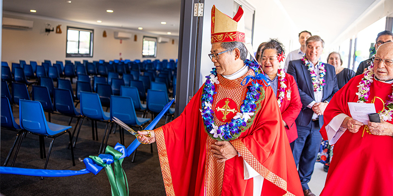 Bishop Vincent Long OFM Conv cuts the ribbon on Marsden Park parish’s new building (Parramatta Diocese)