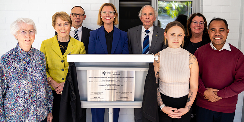 From left: Sr Una O’Loughlin representing the Sisters of St John of God, St John of God Health Care Board Chair the Honourable Kerry Sanderson AC CVO, St John of God Health Care, Group CEO Bryan Pyne, Honourable Hannah Beazley MLA, Minister for Local Government, Disability Services; Volunteering; Youth; Gascoyne, St John of God Health Care Trustees Chair the Honourable Neville Owen AO, Former Horizon House resident and guest speaker, Sophie Lawson, St John of God Social Outreach CEO, Susan Cantwell, Presiding celebrant, Reverend Heri Leba CSsR.