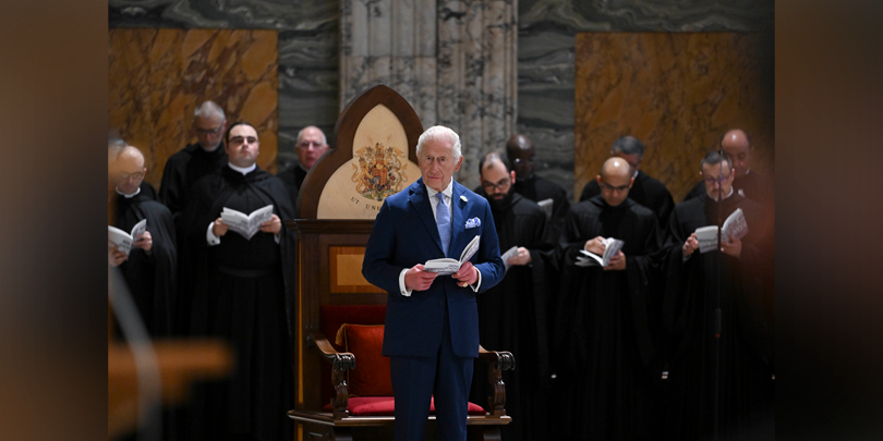 King Charles III stands in front of a chair made to mark his being honoured as a “royal confrater” of the Benedictine monks at the abbey at Rome’s Basilica of St Paul Outside the Walls during an ecumenical prayer service on October 23 (CNS/Vatican Media)