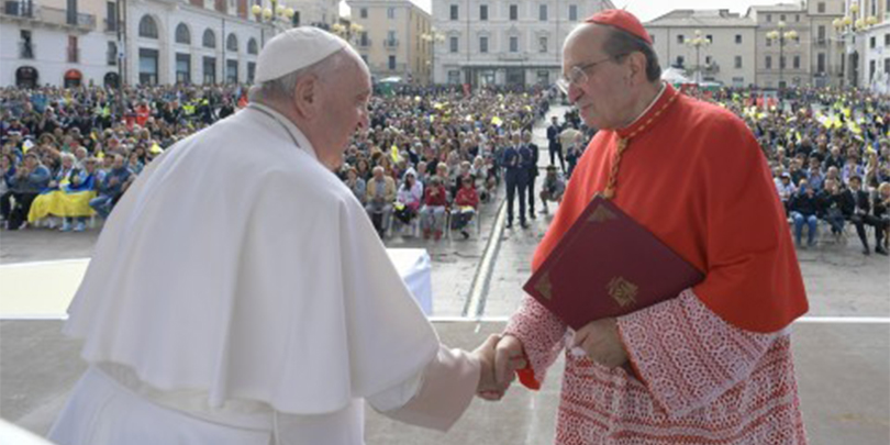 Pope Francis greets Cardinal Giuseppe Petrocchi of Aquila, who is president of the commission that studied the possibility of women deacons in this 2022 file photo (CNS/Vatican Media)