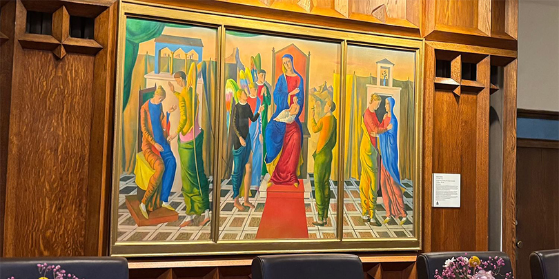 The triptych, by Australian artist Justin O’Brien, depicts Mary holding the infant Jesus in the centre panel, with the events of the Annunciation and the Visitation featured on either side.