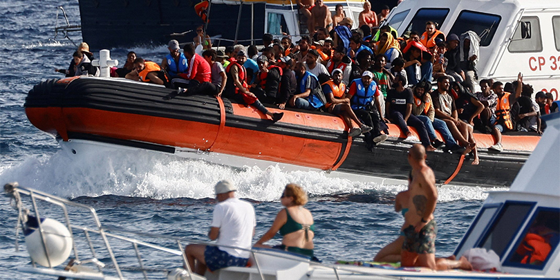 Migrants arrive at the Italian island of Lampedusa in September 2023 (OSV News/Yara Nardi, Reuters)