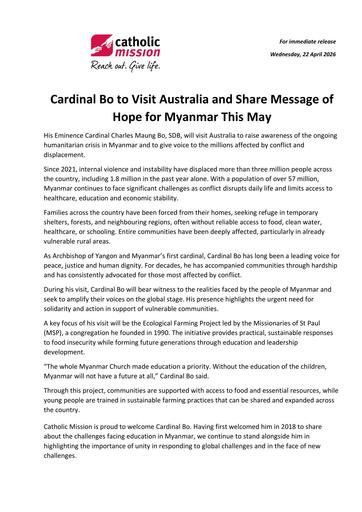 pdf 260422 – Catholic Mission – Cardinal Bo to Visit Australia and Share Message of Hope for Myanmar This May