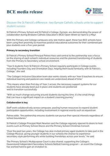 7. 260421 – Brisbane Catholic Education – Discover the St Patrick’s difference two Gympie Catholic schools unite to support student success