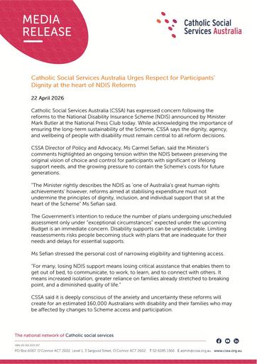 260423 – CSSA – Catholic Social Services Australia Urges Respect for Participants' Dignity at the heart of NDIS Reforms.pdf