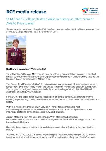 pdf 2604264- Brisbane Catholic Education – St Michael’s College student walks in history as 2026 Premier ANZAC Prize winner