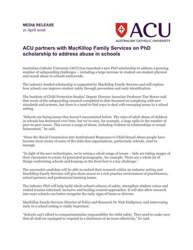 260421 – ACU – ACU partners with MacKillop Family Services on PhD scholarship to address abuse in schools.pdf
