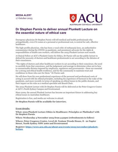 251021 – ACU – Dr Stephen Parnis to deliver annual Plunkett Lecture on the essential nature of ethical care.pdf
