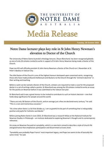 pdf 251028 – UNDA – Notre Dame lecturer plays key role in St John Henry Newman’s elevation to Doctor of the Church