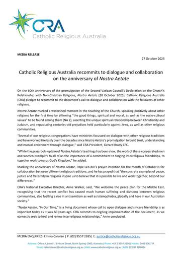 pdf 251027 – CRA – Catholic Religious Australia recommits to dialogue and collaboration on the anniversary of Nostra Aetate