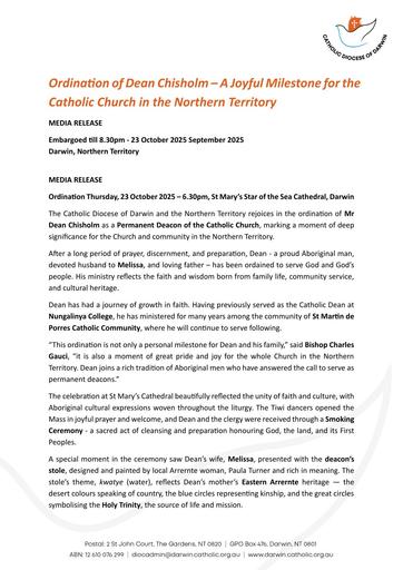 pdf 251023 – Darwin Diocese – Ordination of Dean Chisholm – A Joyful Milestone for the Catholic Church in the Northern Territory