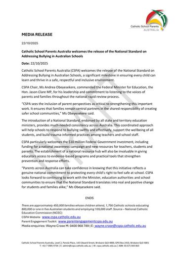 pdf 251022 – CSPA- Catholic School Parents Australia welcomes the release of the National Standard on Addressing Bullying in Australian Schools
