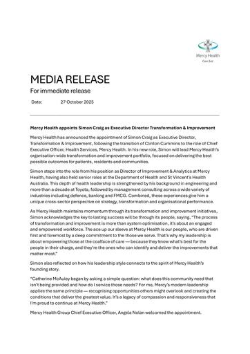 7. 251027 – Mercy Health – Mercy Health appoints Simon Craig as Executive Director Transformation & Improvement